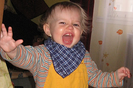 Tíz óra tájt nagyon elfáradtam. Gondoltam, javítok egy kicsit a napi renden, gyorsan megetetem a lurkót, így hátha hamarabb elaltathatom. Megragadtam, leültettem, nyálazót kötöttem az álla alá, és nagy gesztikulálás közepette nekifogtam a reggeli előkészítésének.